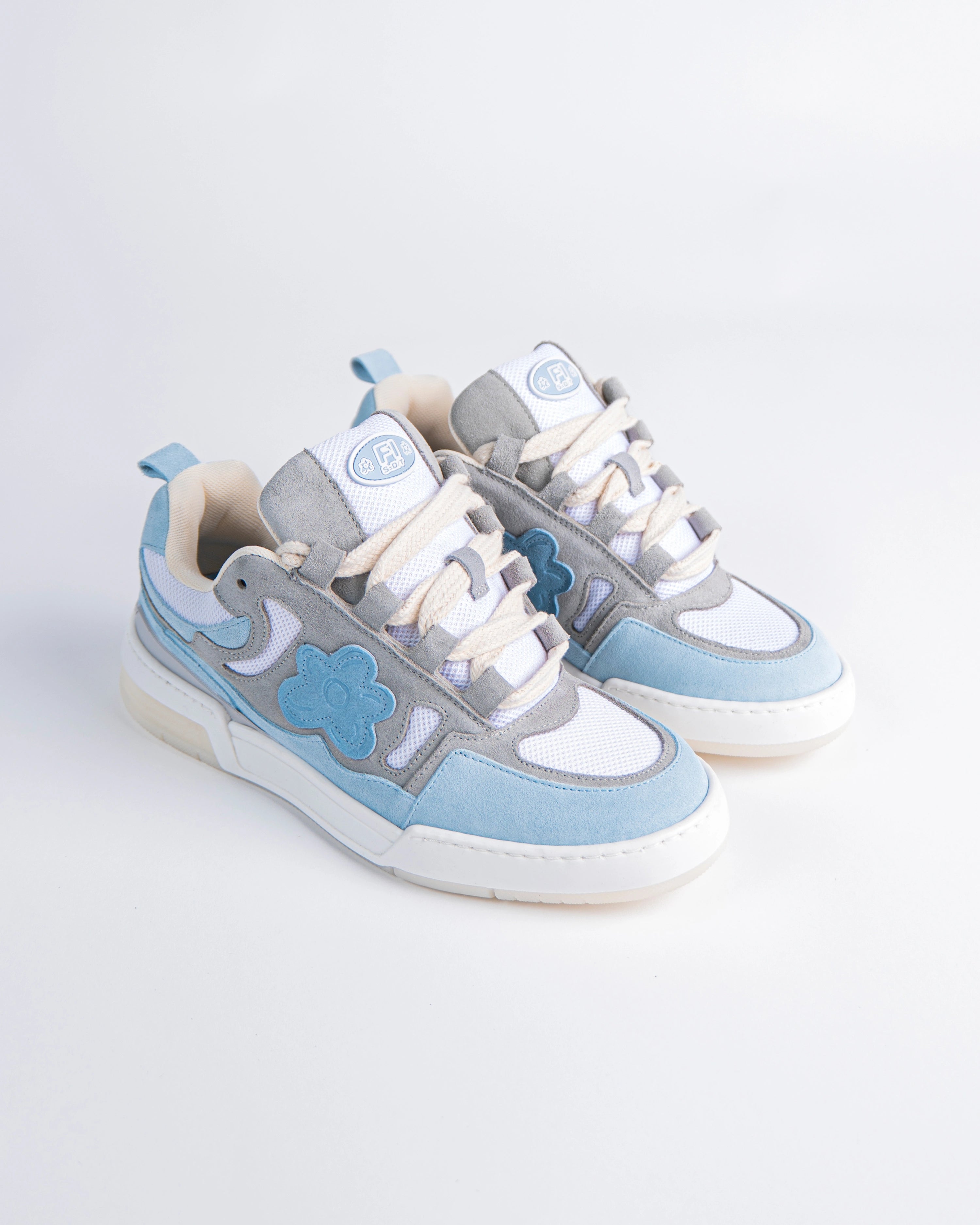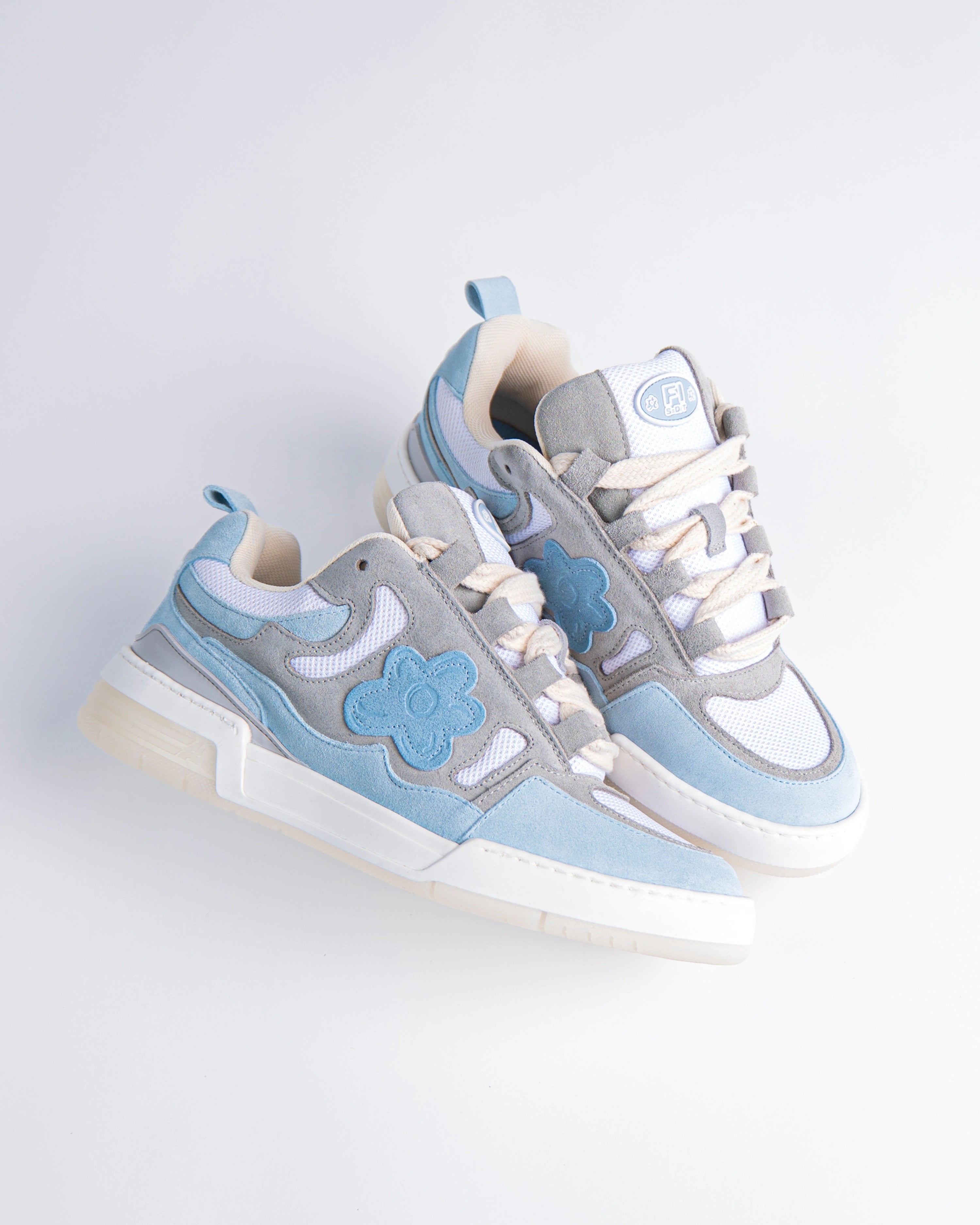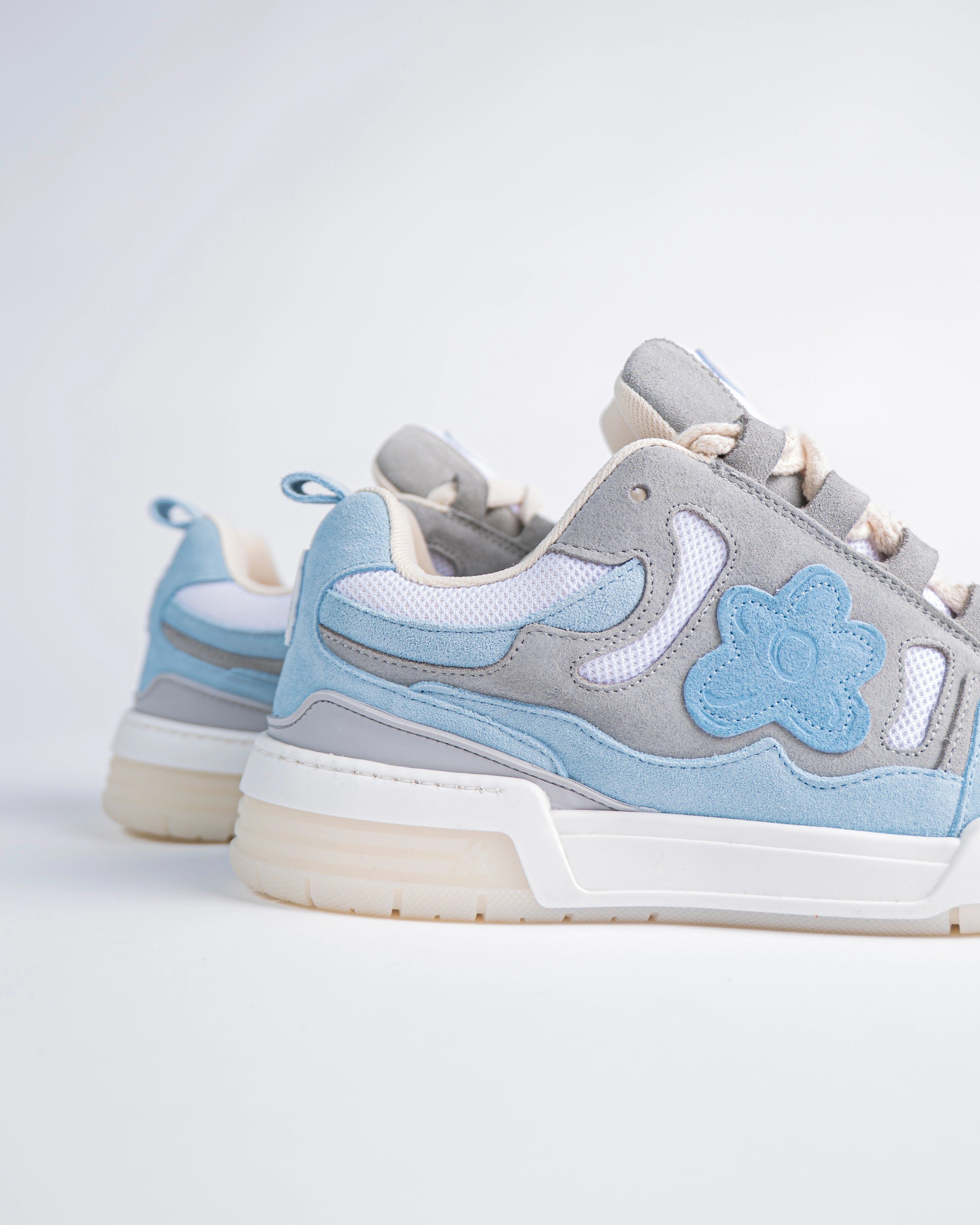 The Paris sneakers reference a '90s inspired design. The upper is elaborate, two-tone of blue and grey and adorned with our signature flower with Italian premium suede material. This model features a chunky look, technical double laces and a two-tone rubber outsole.
