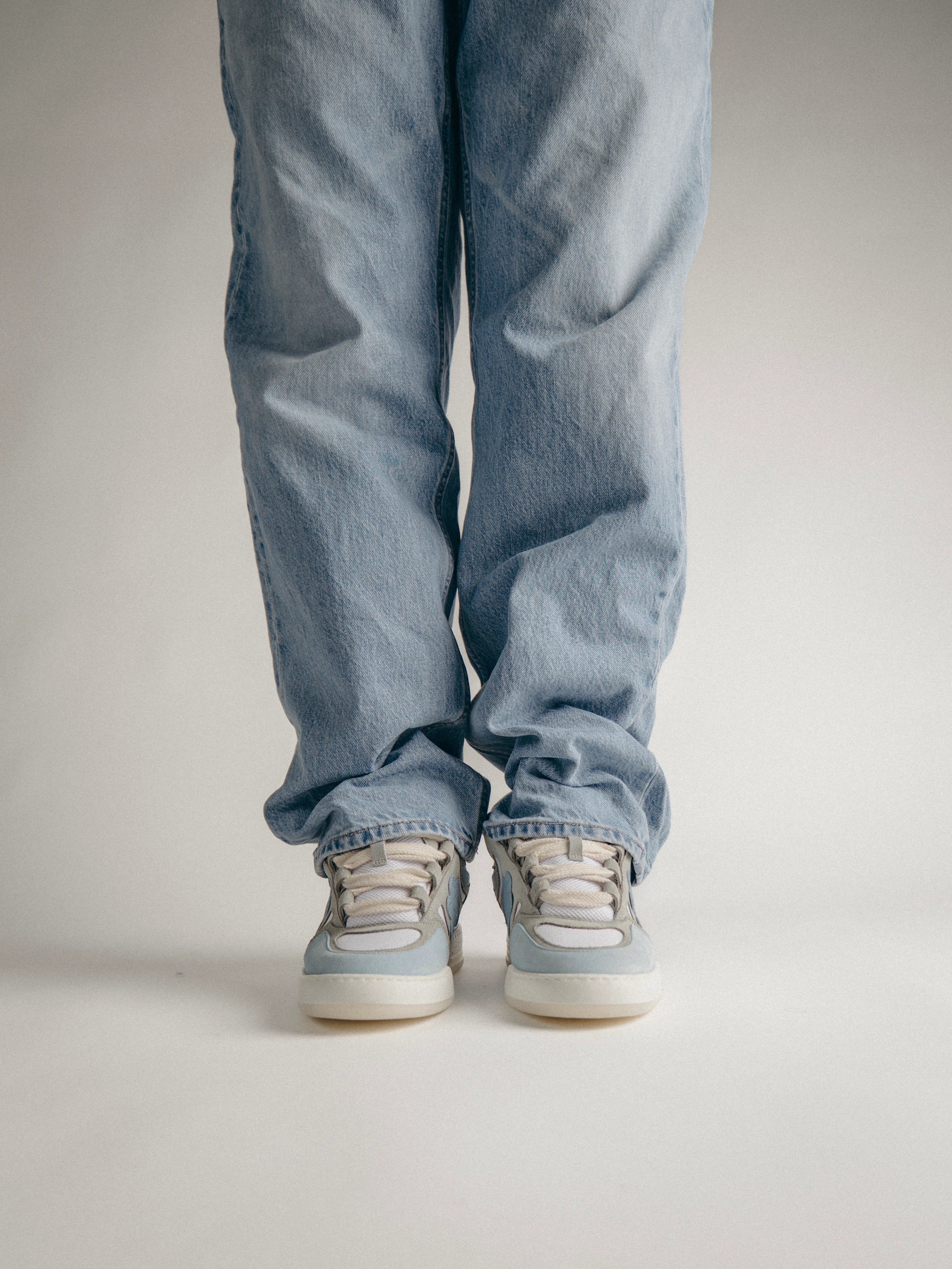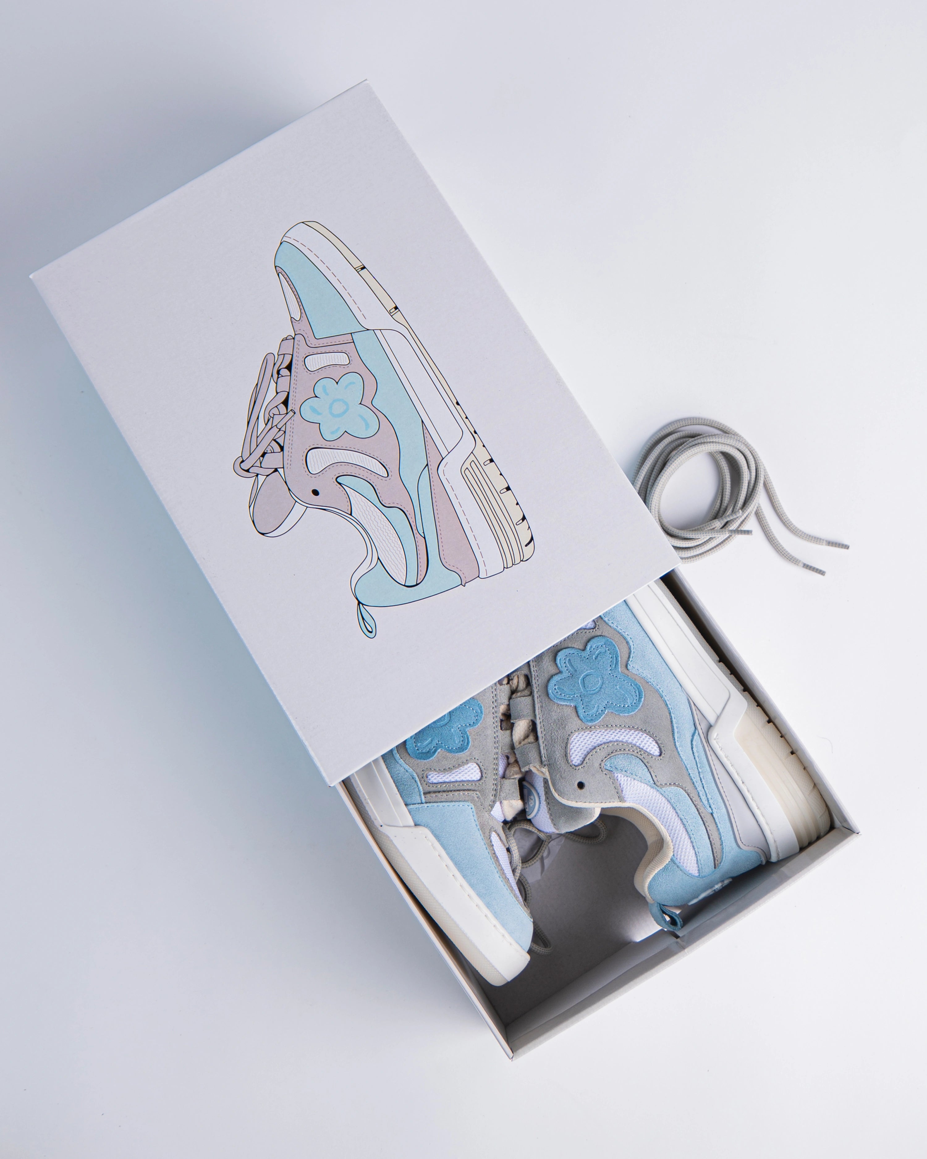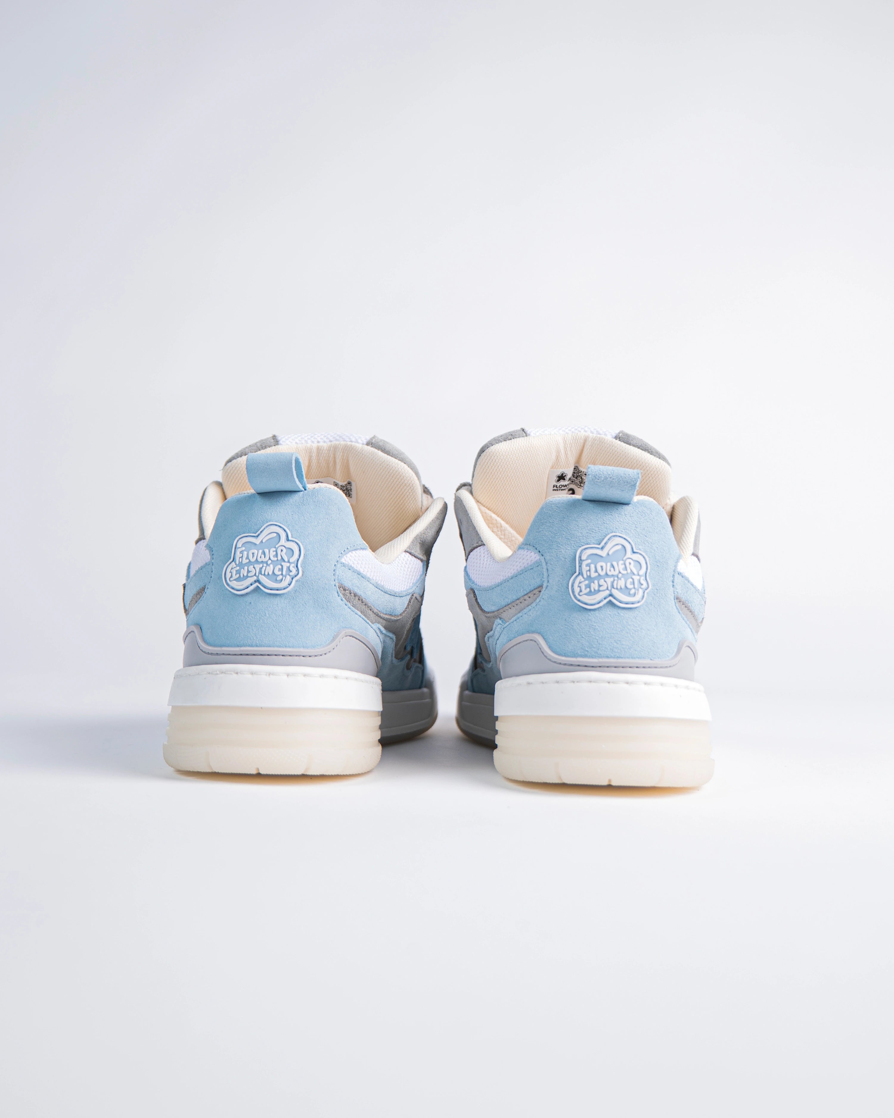 The Paris sneakers reference a '90s inspired design. The upper is elaborate, two-tone of blue and grey and adorned with our signature flower with Italian premium suede material. This model features a chunky look, technical double laces and a two-tone rubber outsole.