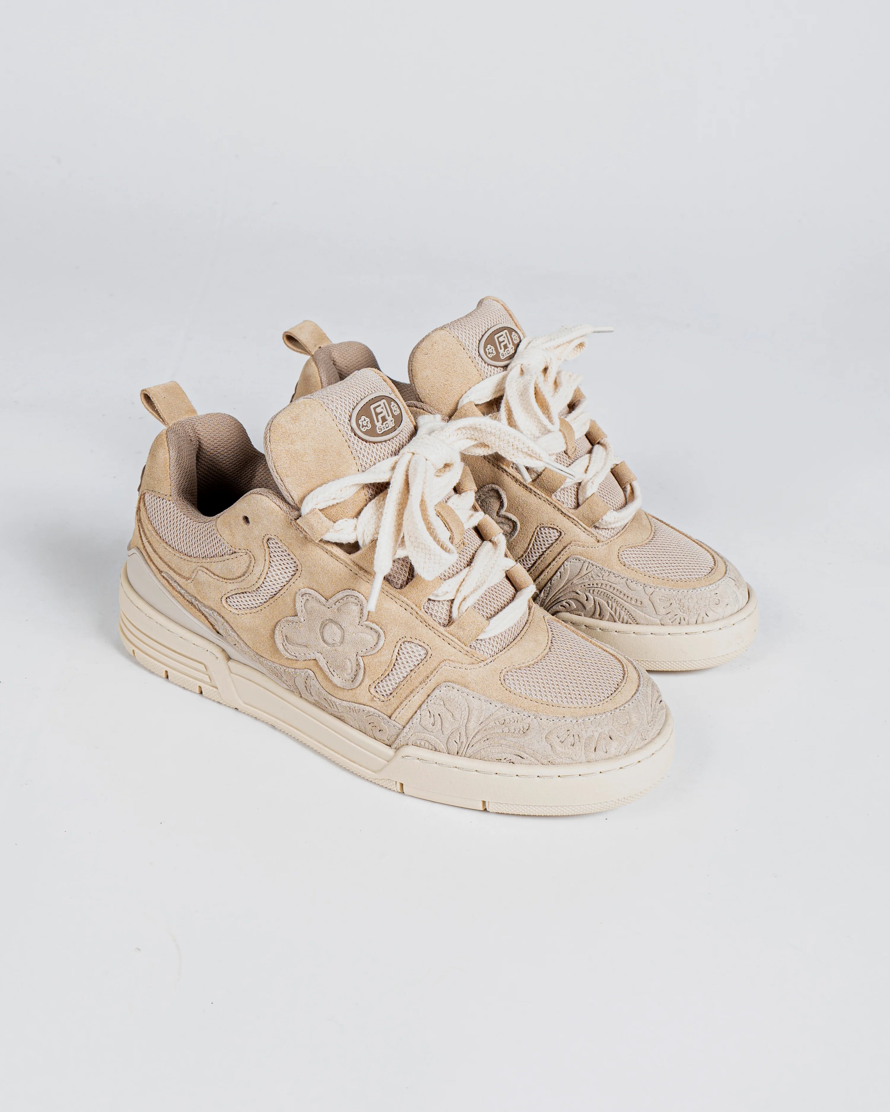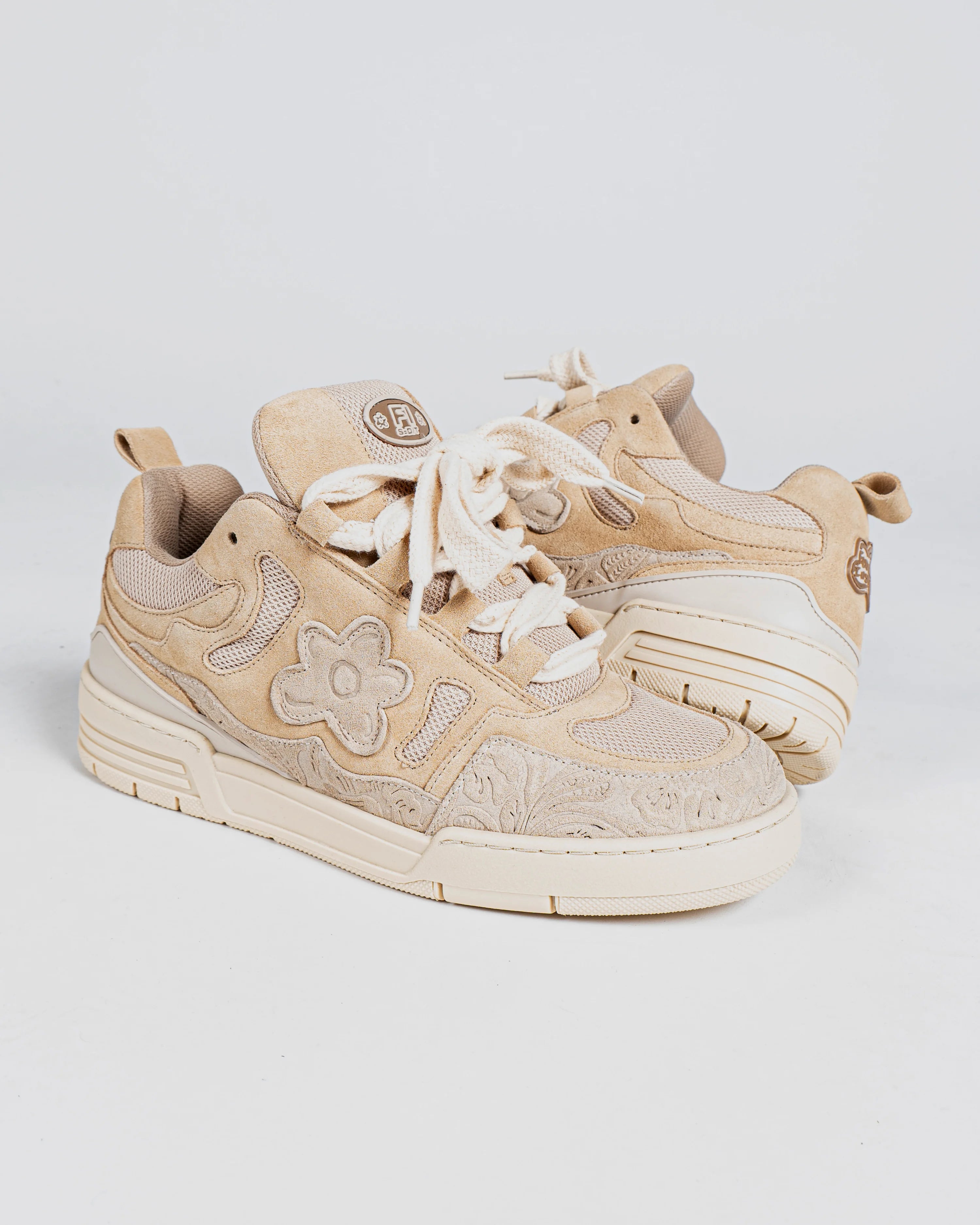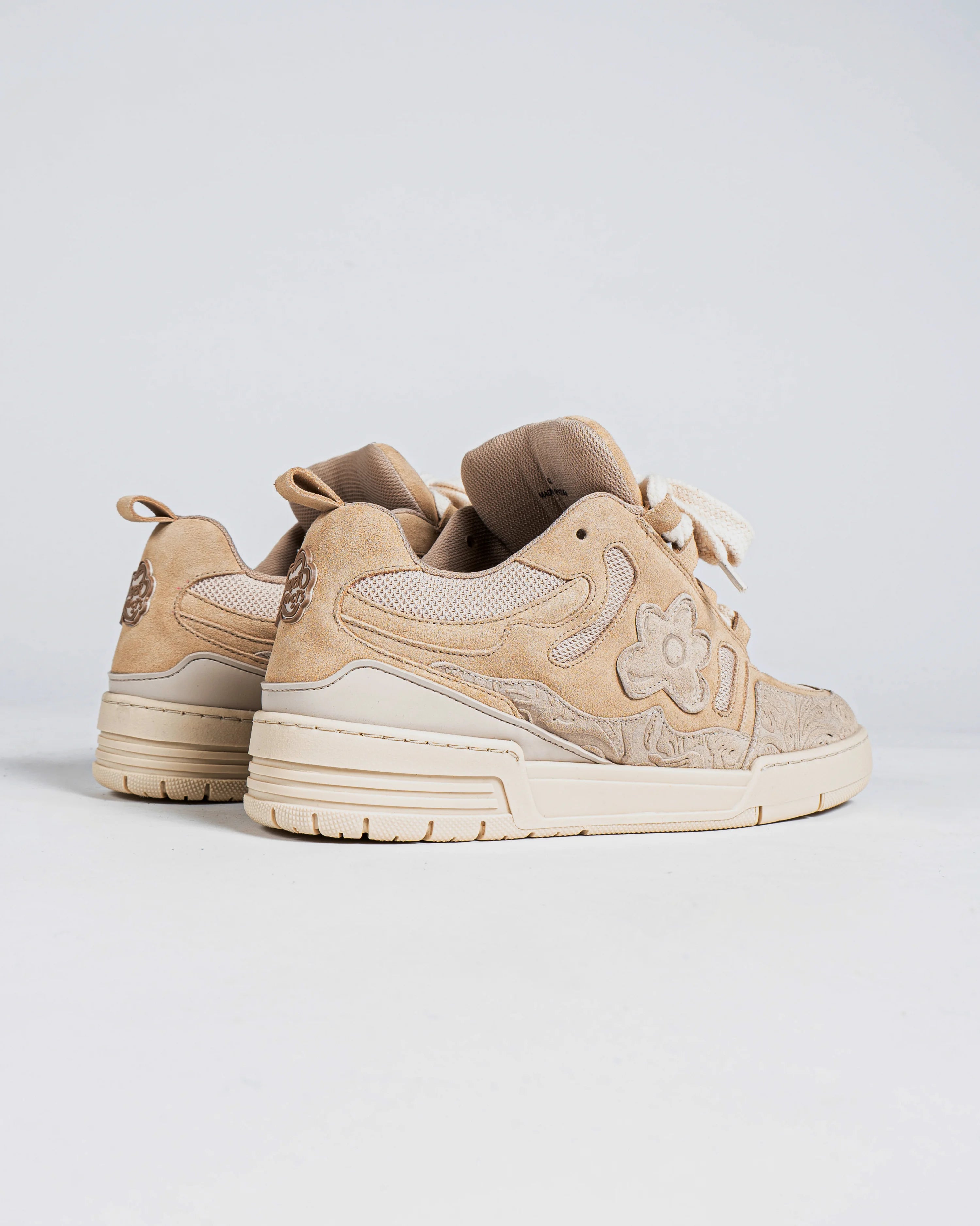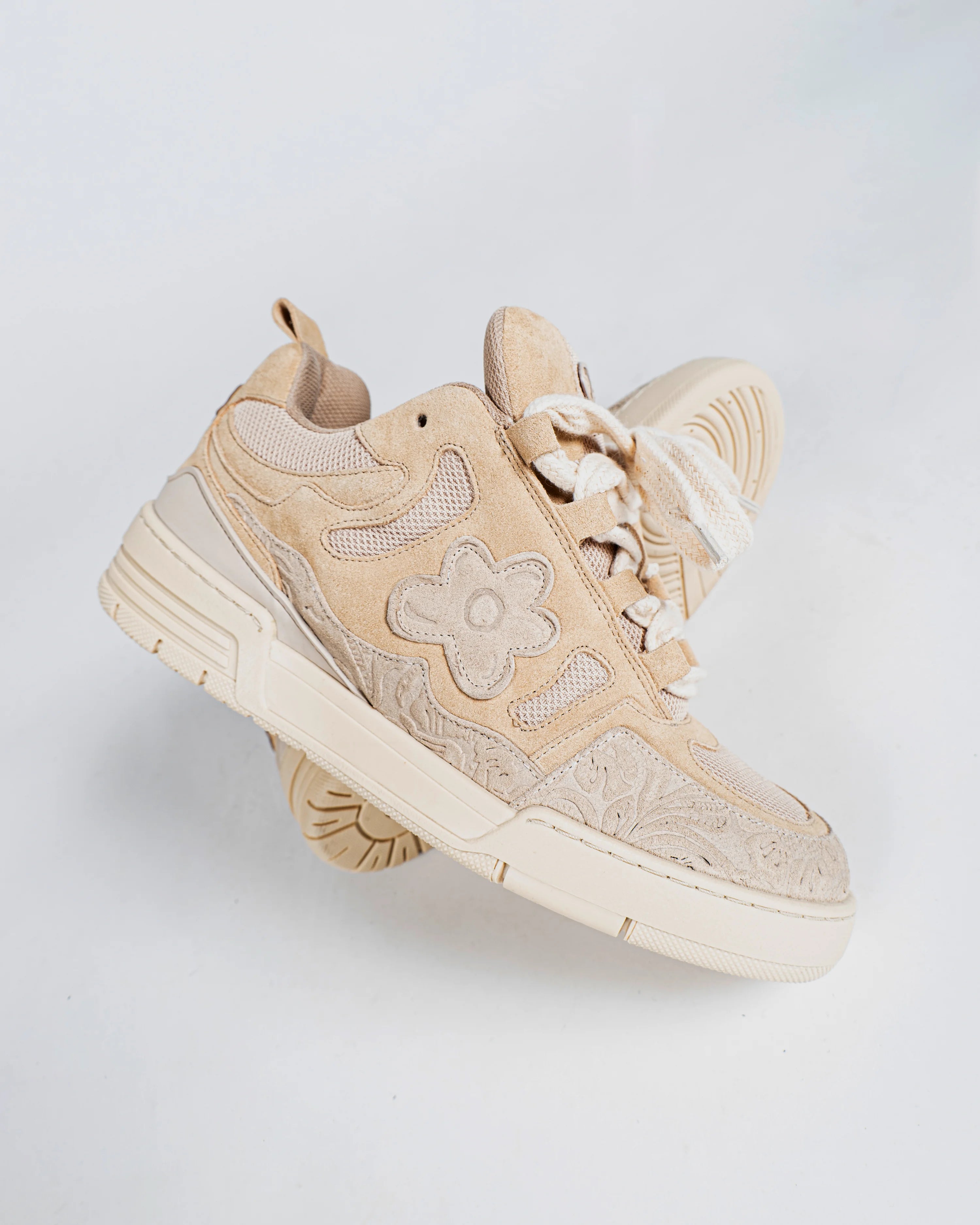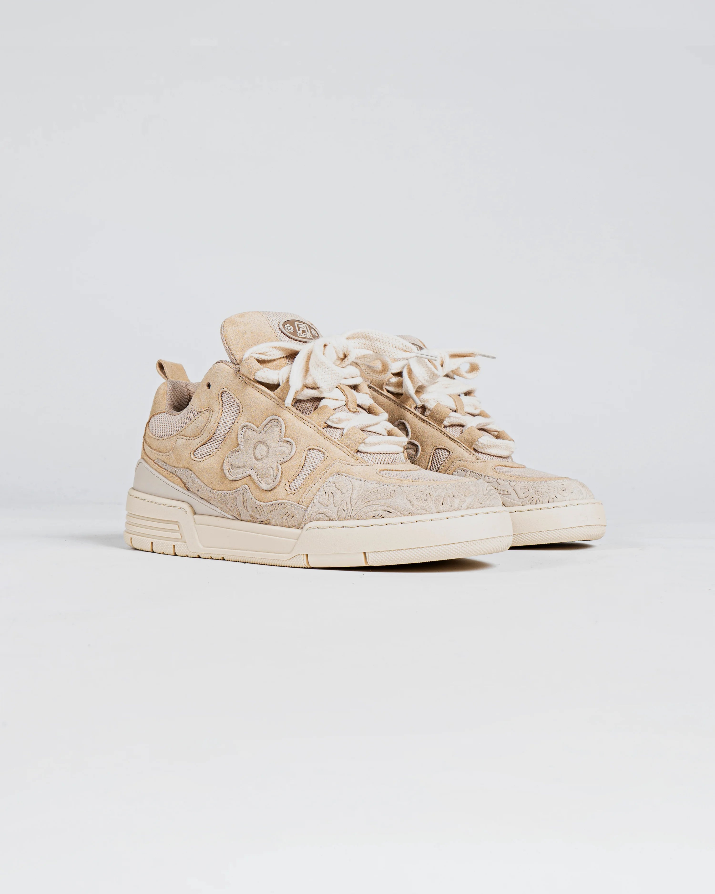 Introducing our highly anticipated Desert Eagle sneakers, ready to make a powerful statement against the wars that plague our world. Handcrafted with love in Portugal, these sneakers are adorned in elegant beige suede to pay homage to the vast deserts that hold so much history. And wait until you see the touch of baroque floral embossing we've added, it's simply enchanting.