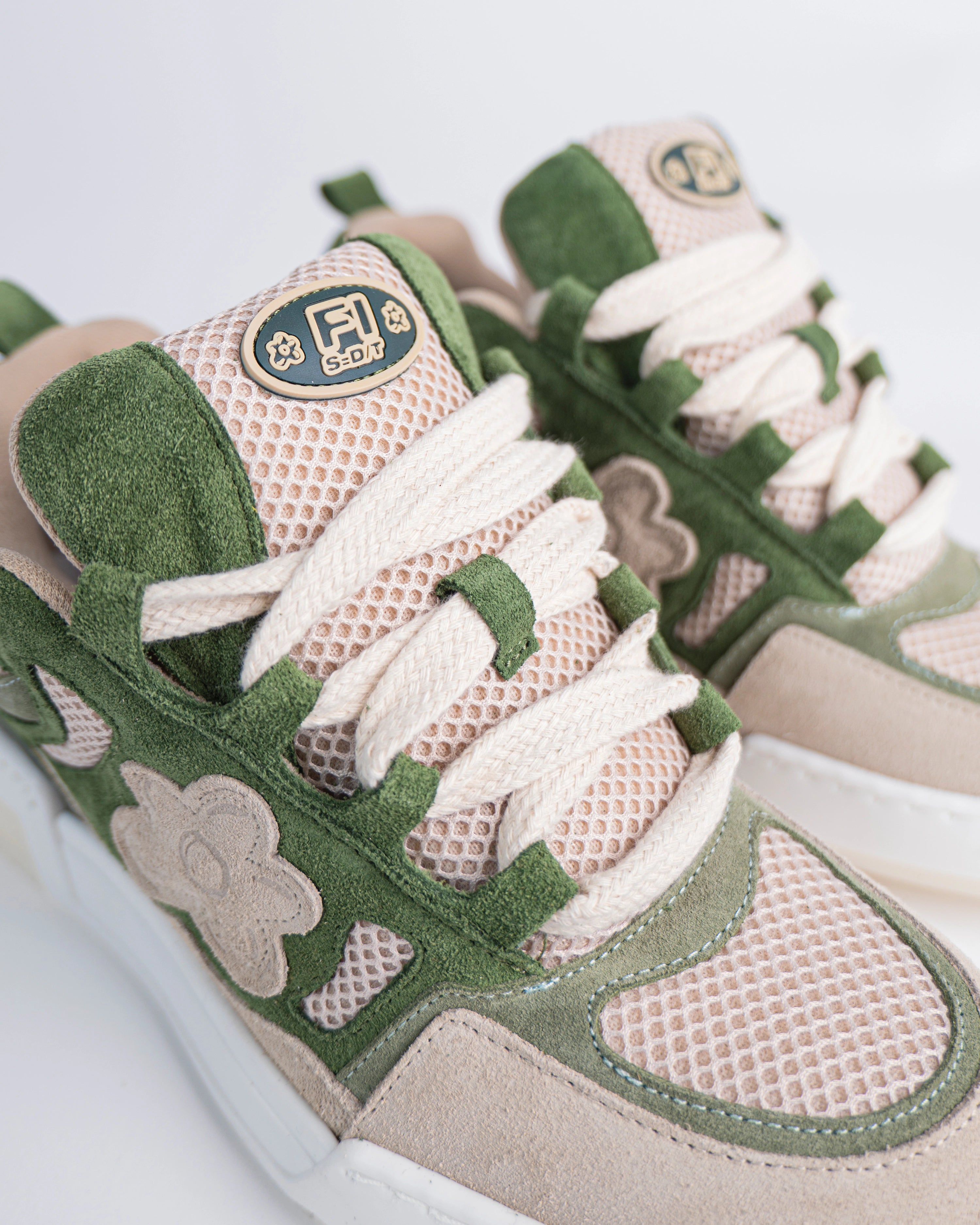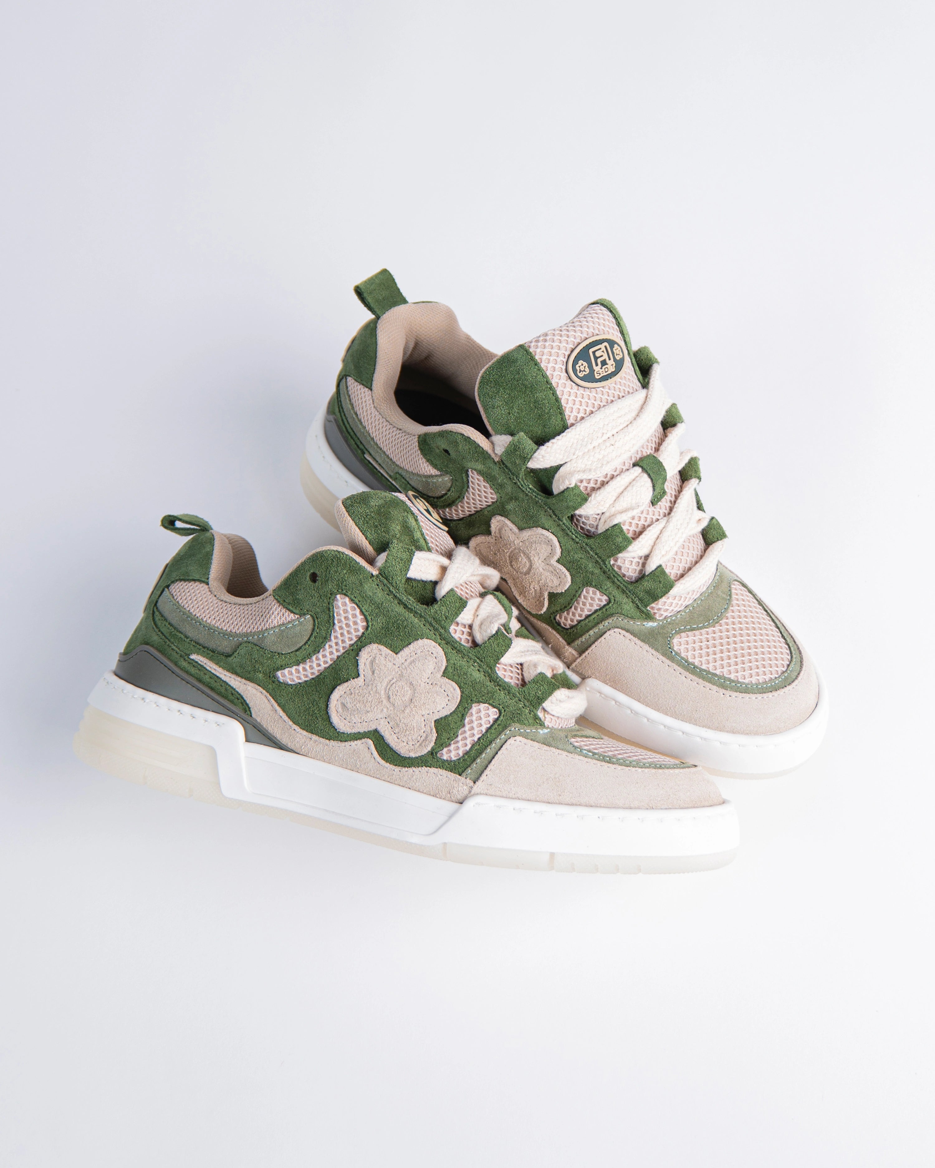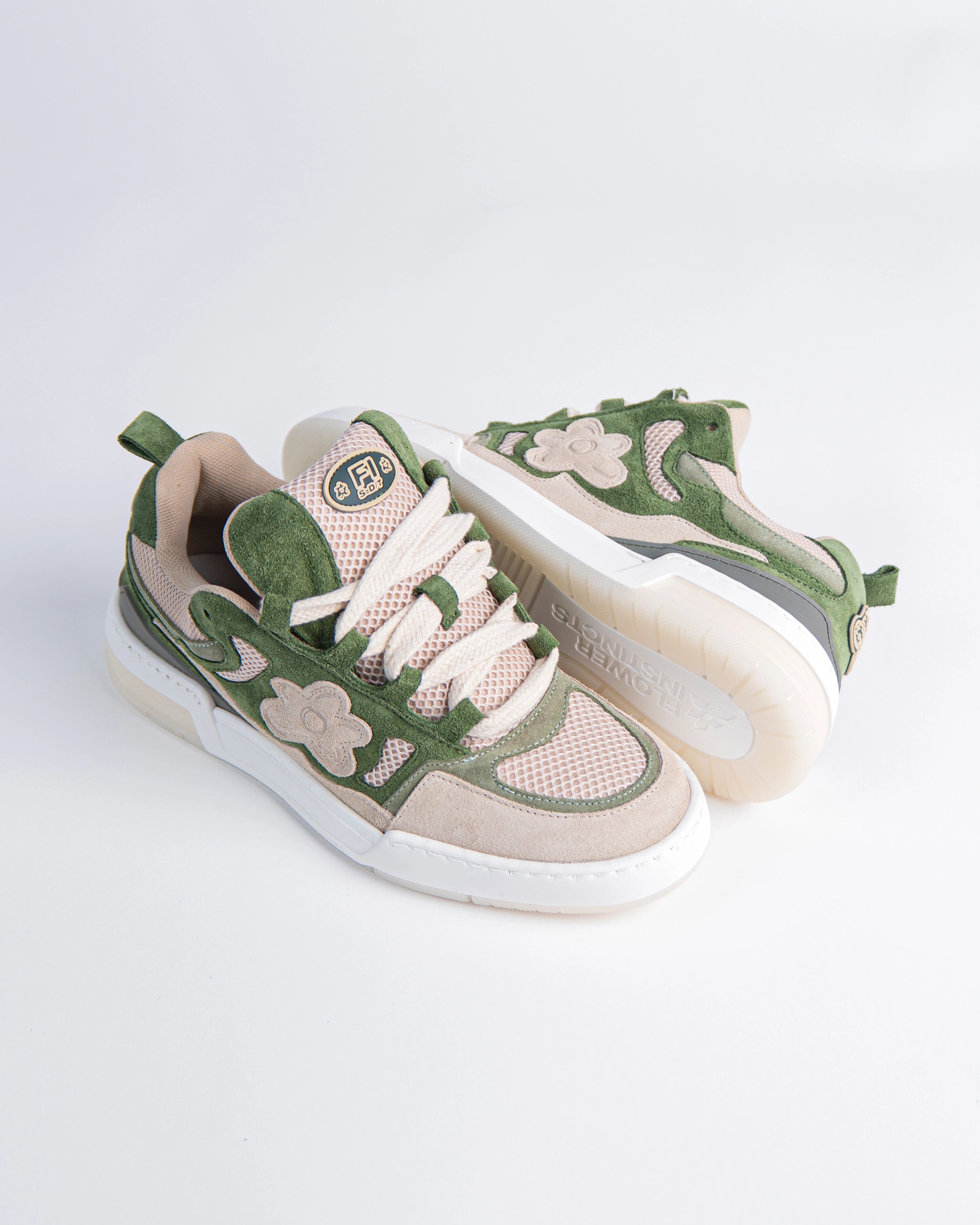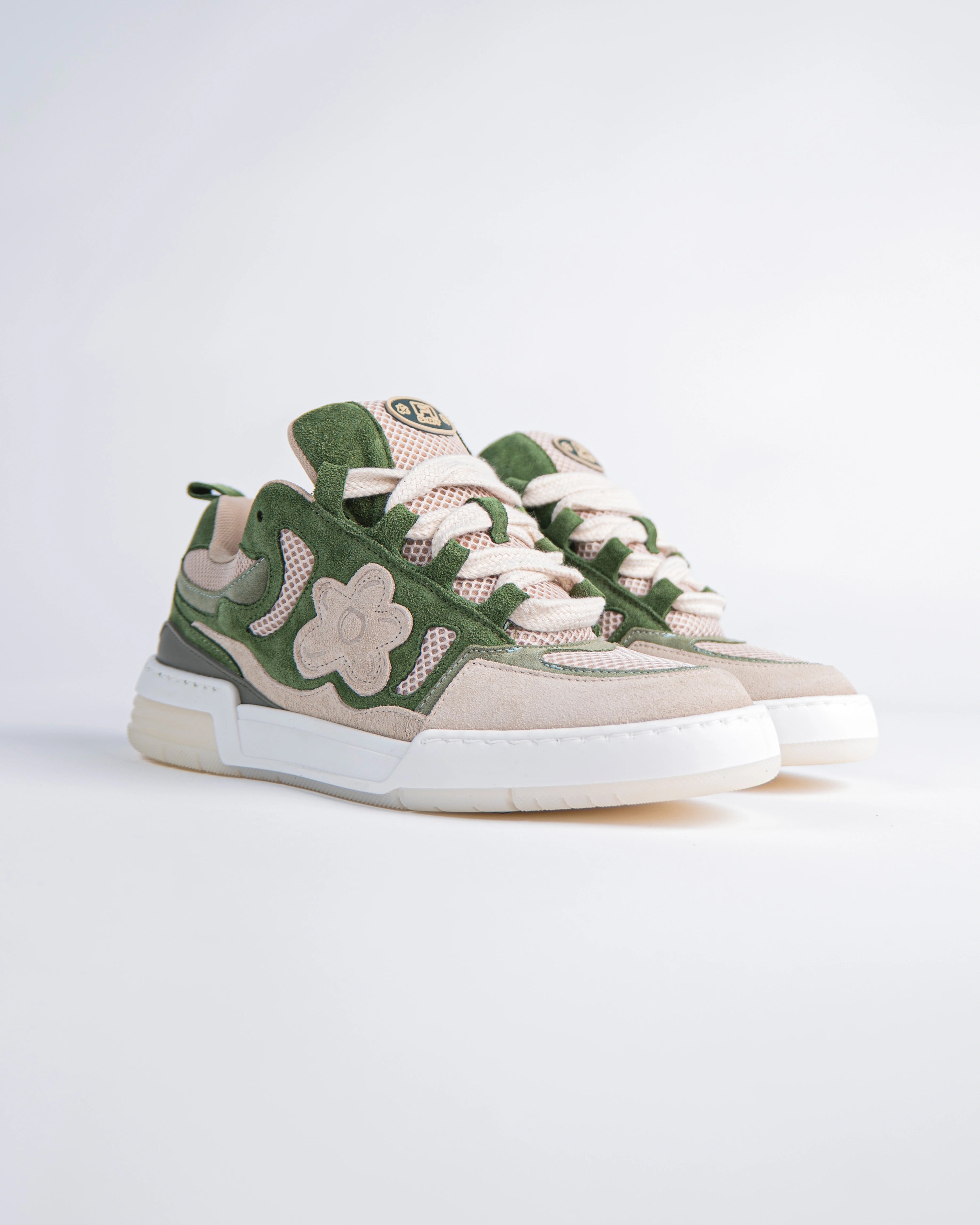The Super Opium sneakers reference a '90s inspired design. The upper is elaborate, two-tone of green and creme and adorned with our signature flower with Italian premium suede material. This model features a chunky look, technical double laces and a two-tone rubber outsole.