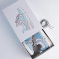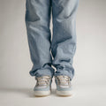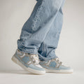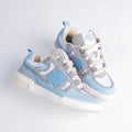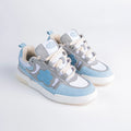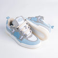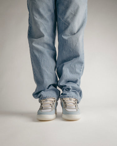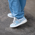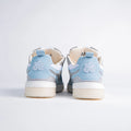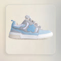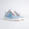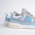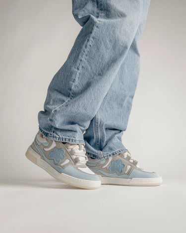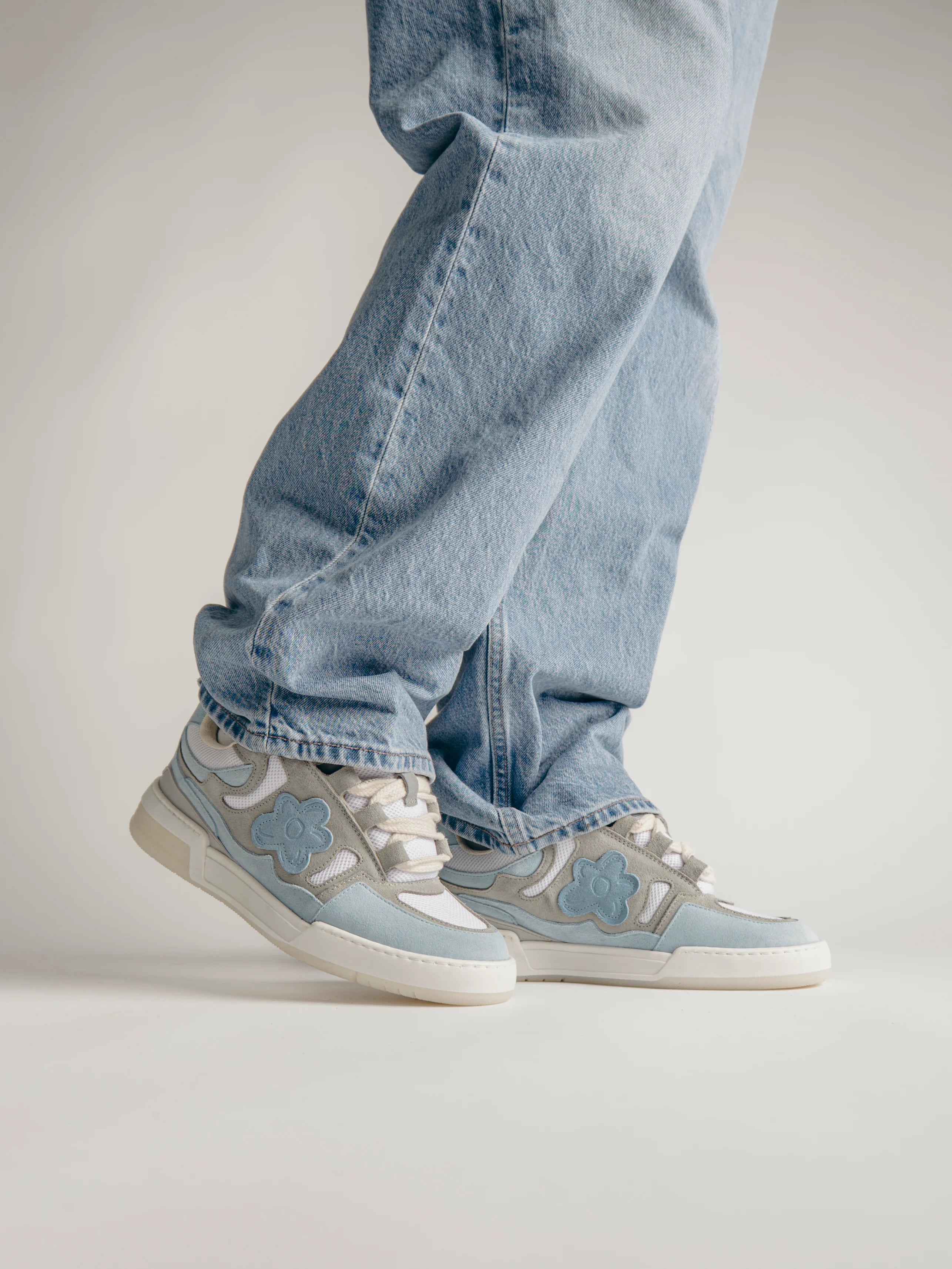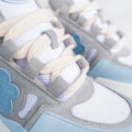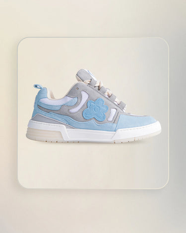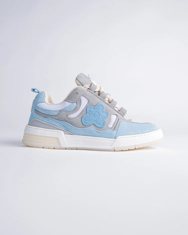 The Paris sneakers reference a '90s inspired design. The upper is elaborate, two-tone of blue and grey and adorned with our signature flower with Italian premium suede material. This model features a chunky look, technical double laces and a two-tone rubber outsole.